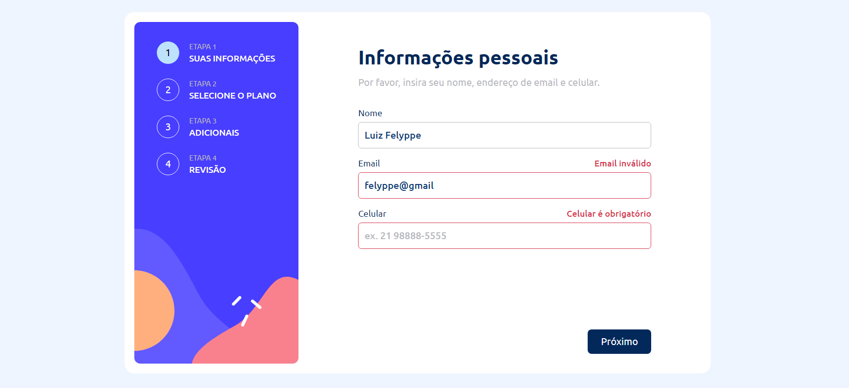 Um formulário multietapas qualquer que eu fiz para treinar validações de input do usuário usando a biblioteca zod (estava sem programar em React).