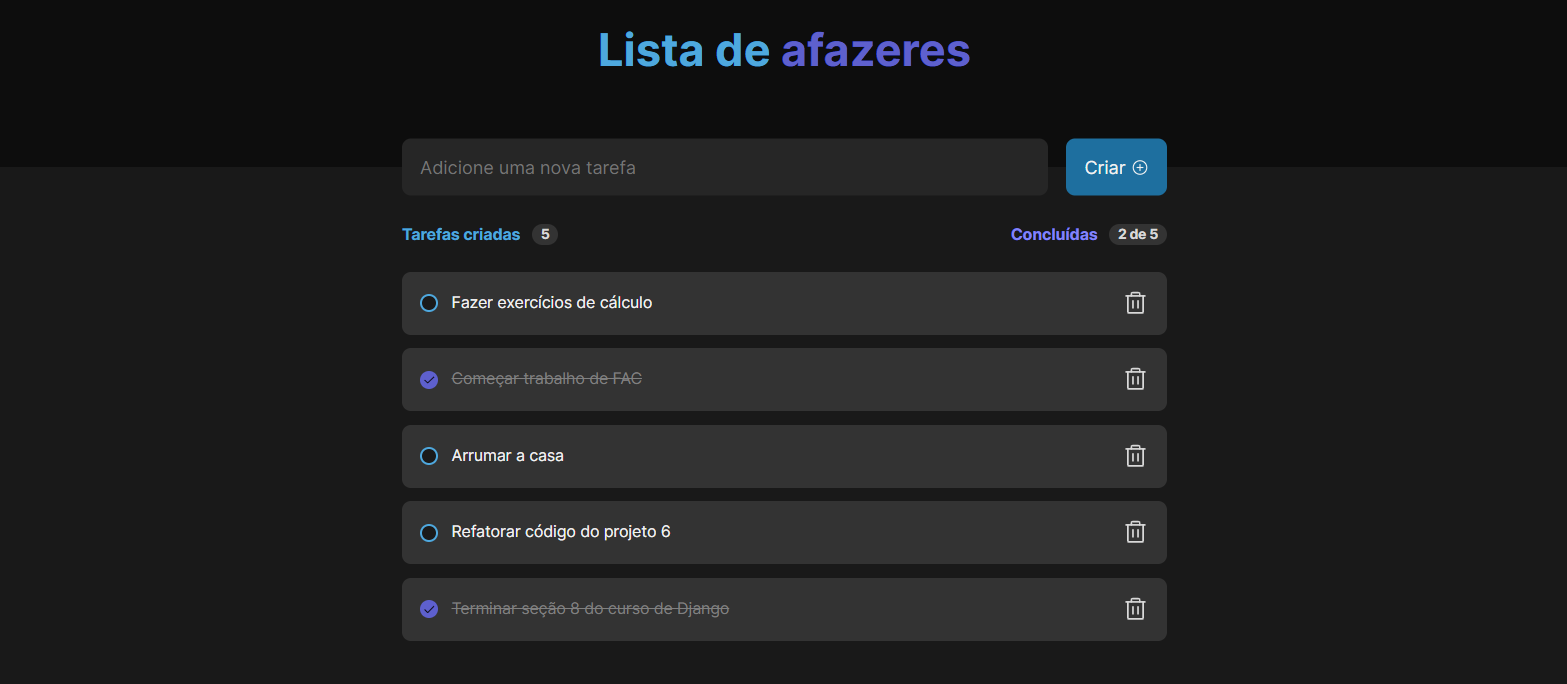 Uma lista de afazeres para você não esquecer das suas tarefas! Esse projeto foi feito no curso da Rocketseat e foi o meu primeiro usando React JS.